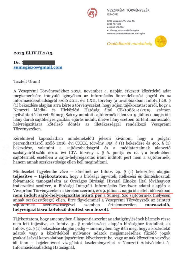 2019. július 1. napja óta eltelt időszakban nem indult sajtó-helyreigazítás iránti per a Sümegi Szó sajtótermék (helyesen annak szerkesztősége) ellen. Erre figyelemmel a Veszprémi Törvényszék az érintett sajtótermék szerkesztőségével szemben értelemszerűen marasztaló, helyreigazításra kötelező döntést sem hozott.