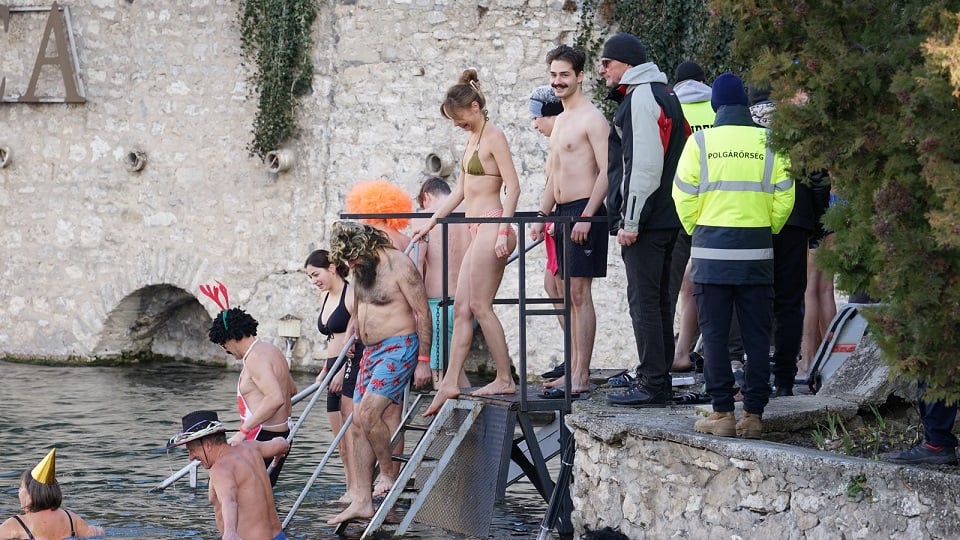 A jókedvű mártózók az úszógumikat, strandlabdákat sem hagyták otthon. Volt, aki unikornis hátán napozott pizsamában, más parókában, mikulás sapkában, sombreroban, vagy álarcban úszott. A Veszprém Vármegyei Búvárklub tagjai idén is csobbantak, miután néhány héttel ezelőtt megtisztították a tavat egy gyakorlat keretében. A Takács Percussion zenekar háttér zenét biztosított a bátor fürdőzők kikapcsolódásához, a nulla fokos levegő és a 18 fokos víz a szökőkút kávájára csalt sokakat, akik aztán látványos ugrásokkal szórakoztatták a partról szurkolókat.